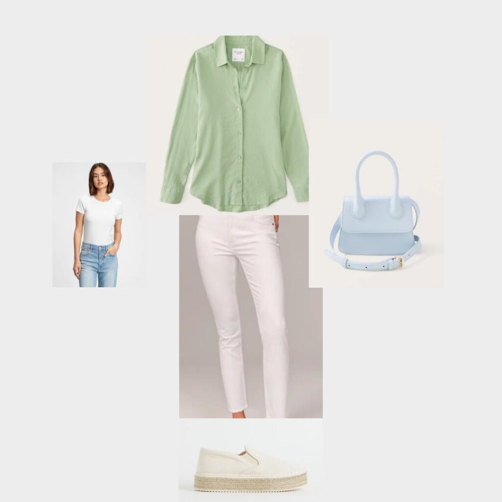 For those restaurants that are more upscale. Try this casual outfit. Pair a linen blouse with some white skinny jeans and a little blue bag and you will be feeling light and bright.