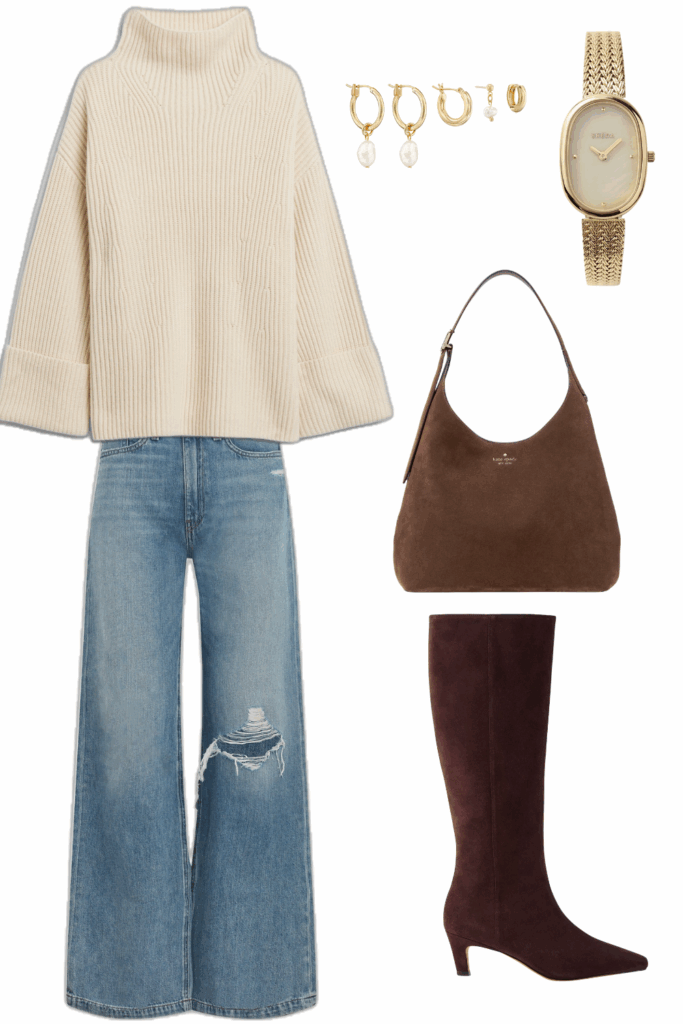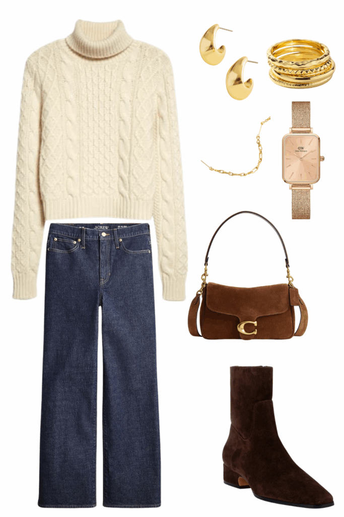 If you want a Thanksgiving outfit that’s classic, cozy, and guaranteed to look chic in family photos, this is the combo. A chunky cream turtleneck pairs perfectly with wide-leg denim, and the tall brown boots give the whole look a polished, slightly elevated fall vibe. Add in warm gold jewelry and a structured brown shoulder bag, and you’re basically the Pinterest version of “effortless.”