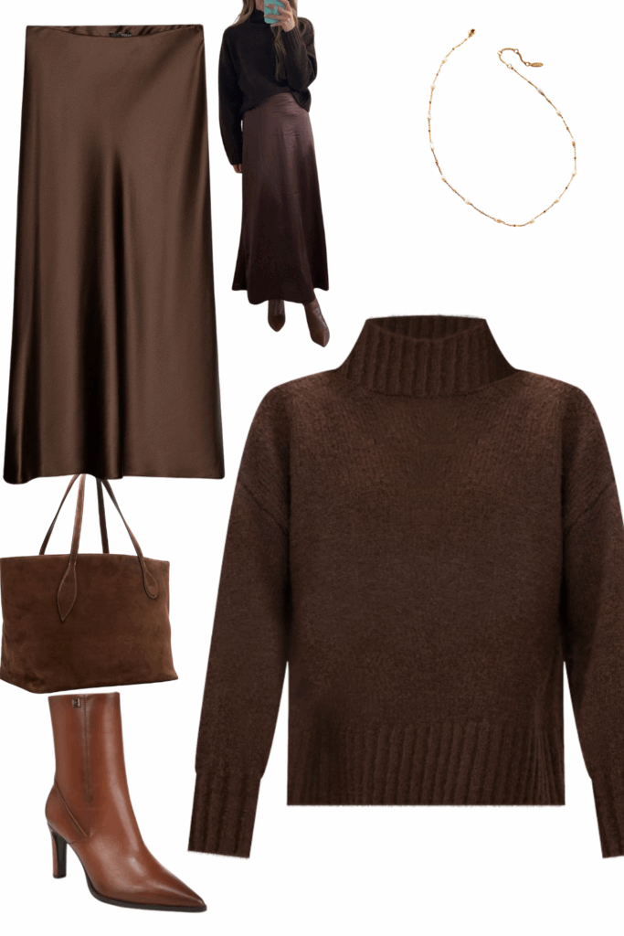 If you want something that strikes the perfect balance between casual and elevated, this combo is it. The denim shirt keeps things relaxed, the satin slip skirt adds a soft dressy touch, and the slouchy boots pull everything together in that effortlessly stylish way. Add a fun belt and gold earrings to finish the look