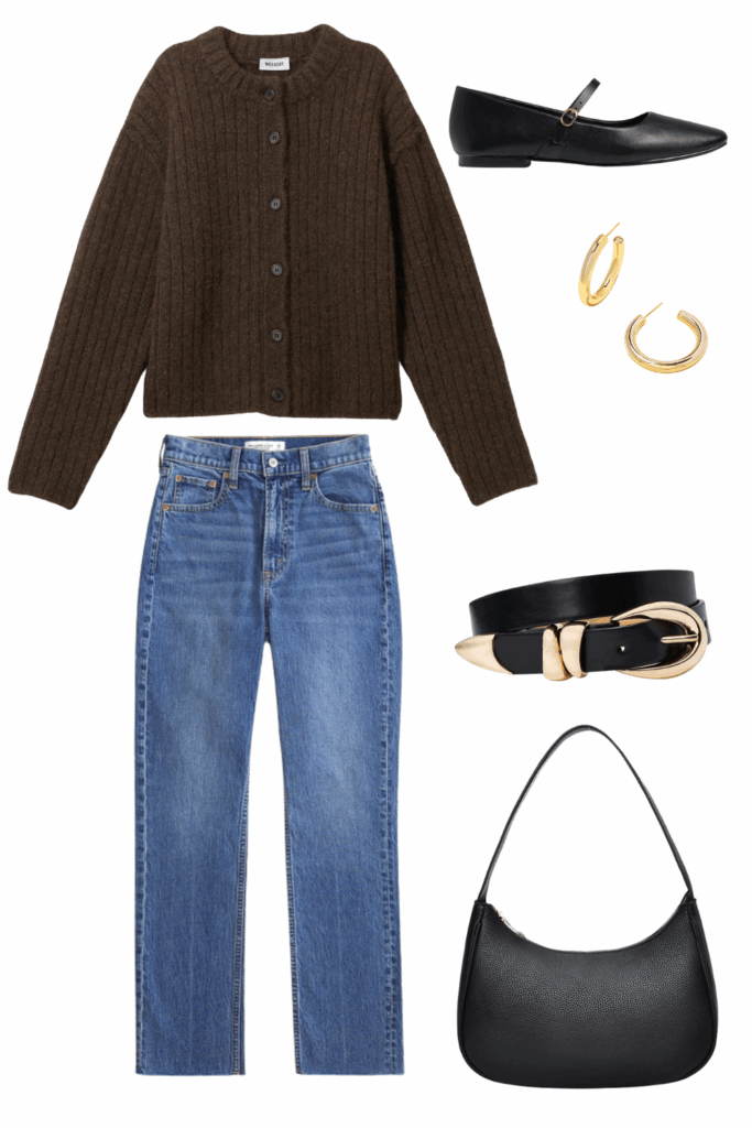 If you’re going for that “I look effortlessly put together without even trying” vibe this Thanksgiving, this outfit nails it. The warm brown cardigan adds that perfect fall coziness — like you’re basically wrapped in a pumpkin-spice-flavored hug. Layering it over a sleek black tank keeps the look modern and minimal, while the straight-leg jeans make the whole outfit feel grounded and easy to wear (even after a second helping of stuffing).