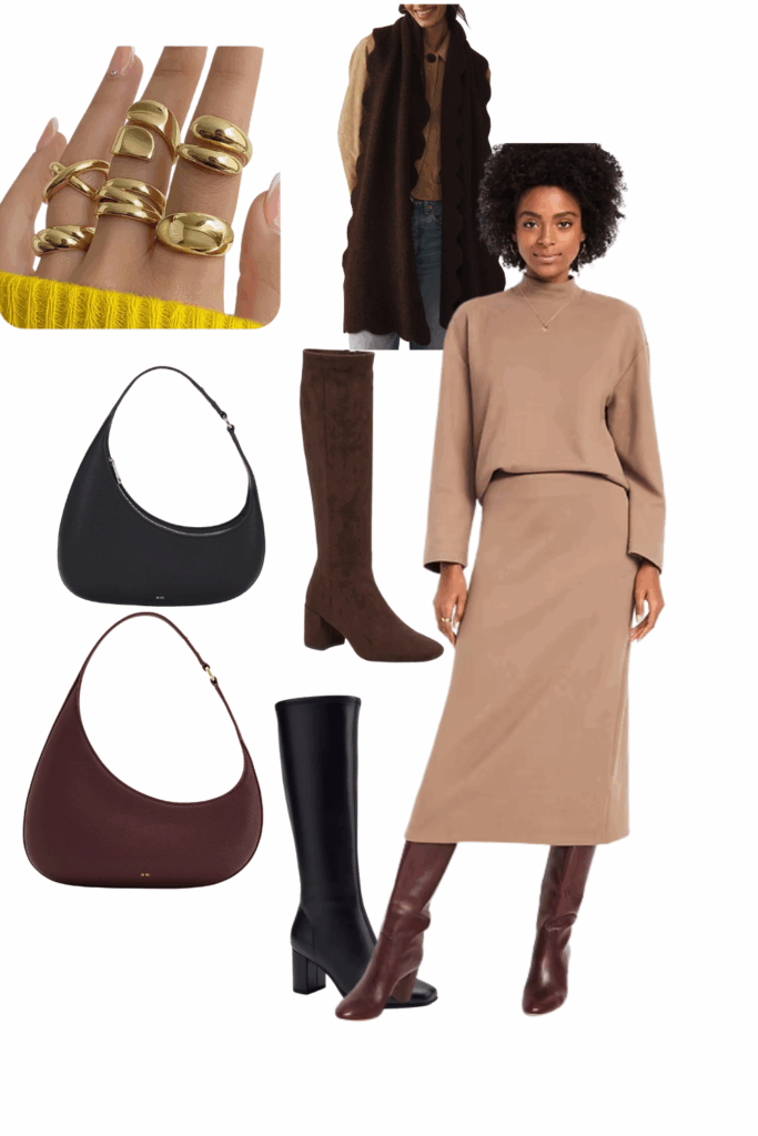 A simple midi dress in a solid color (like neutrals ) plus a standout necklace or scarf and neutral heels or boots. It is a clean and effortless style, and you’re comfortable but look put together.