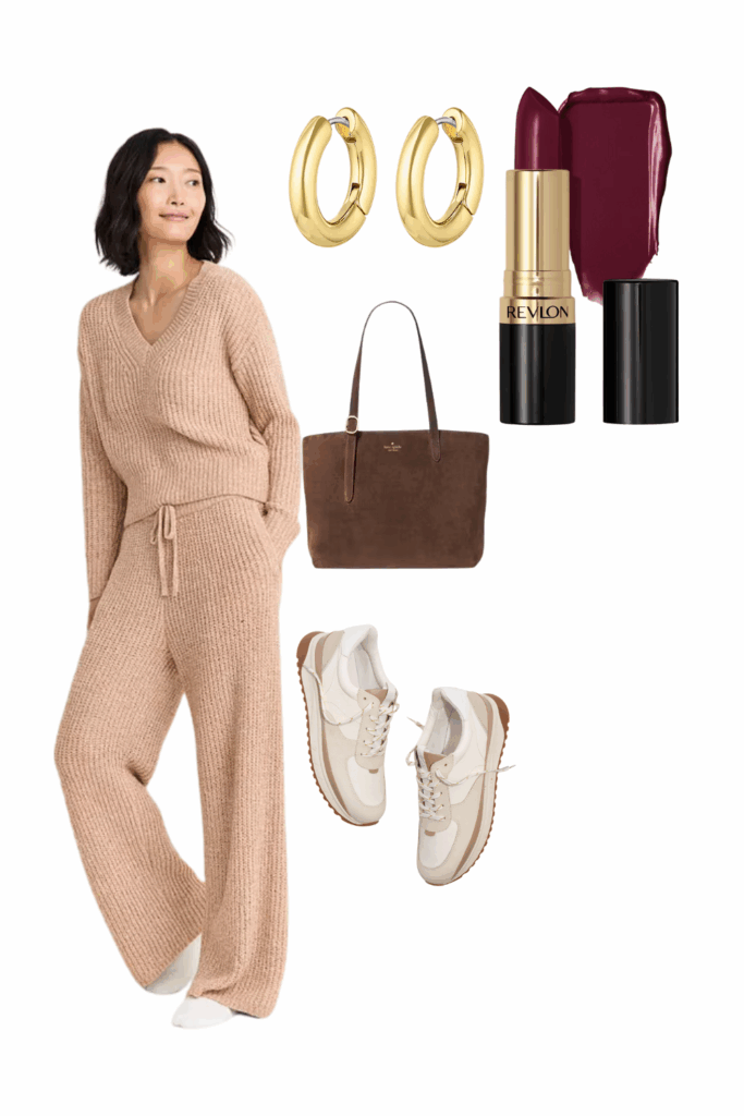 A knit sweater + coordinating pants (maybe a soft chenille or cashmere blend) with slippers or polished sneakers. If your Thanksgiving is home-based, relaxed and full of comfort, you’ll want something that looks intentional but feels like sweatpants. This would be my kind of outfit!