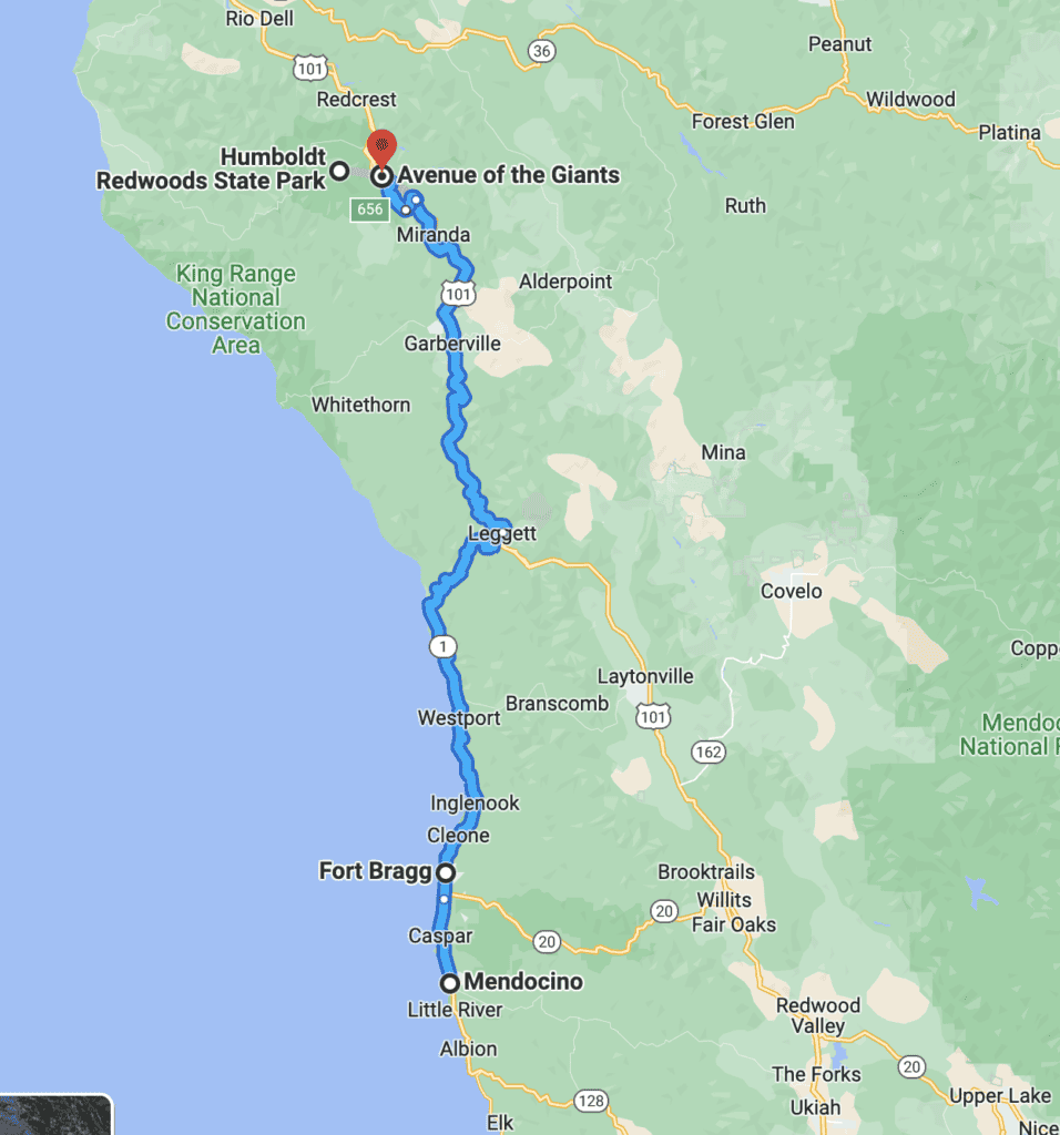 Humboldt Redwoods State Park is about 2 hours north of Fort Bragg and is home to the iconic 31 miles drive Avenue of the Giants.