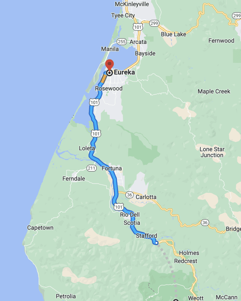 A road trip from San Francisco to Eureka takes roughly 6 hours and is about 300 miles and can be completed in one day. However, you’ll want to factor in time for stops along the way. In this suggested road trip from San Franciso to Eureka, it will take you 4-5 days with an average drive time of 1.5 hours per day.