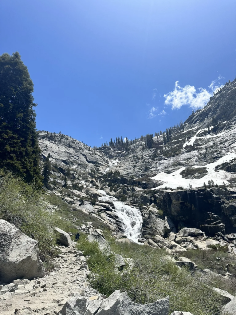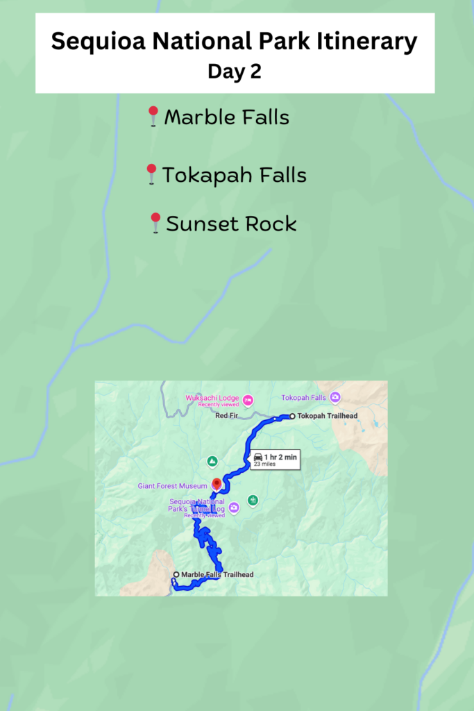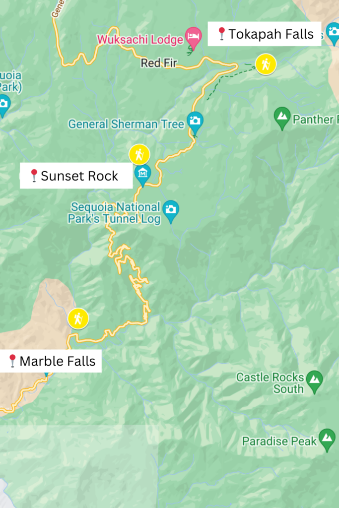 The Marble Falls Trail is a 7.2-mile roundtrip hike located near the Canyon View area. It descends steeply into the canyon to a beautiful waterfall. The trail can be strenuous due to the elevation change and exposed sections. Allow 4-6 hours for this hike. If you choose this option, you might need to skip the next stop, Tokopah Falls or just wake up really early.