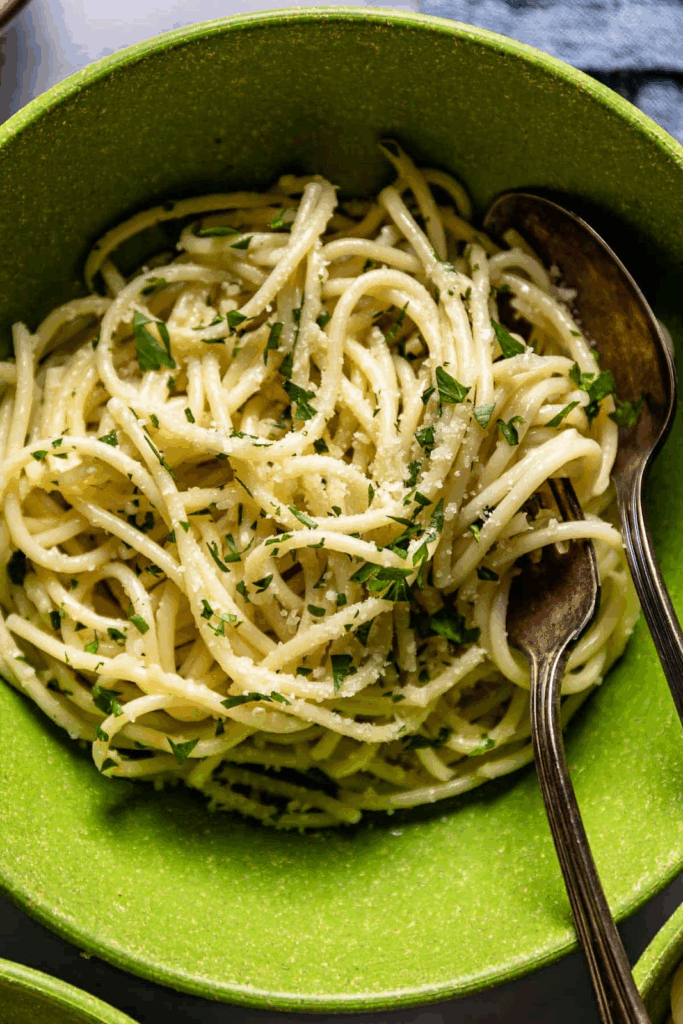 Pasta with butter garlic is one of my favorites among all my easy recipes for spaghetti noodles. You have all the ingredients in your kitchen and it is super satisfying. Add shrimp or chicken to this dish for some protein.