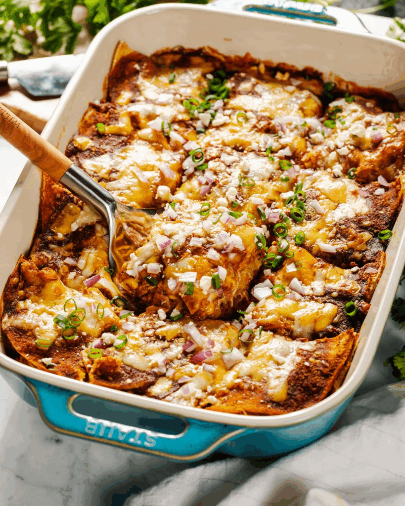 This enchilada casserole is an easy, versatile weeknight meal inspired by a reader’s idea. Instead of rolling tortillas, you simply layer them flat. It’s quick (15 minutes prep, 30 minutes bake), adaptable for chicken, beef, or vegetarian/vegan diets, make-ahead friendly (assemble up to 24 hours early or freeze), and delicious, loved by everyone who tries it.